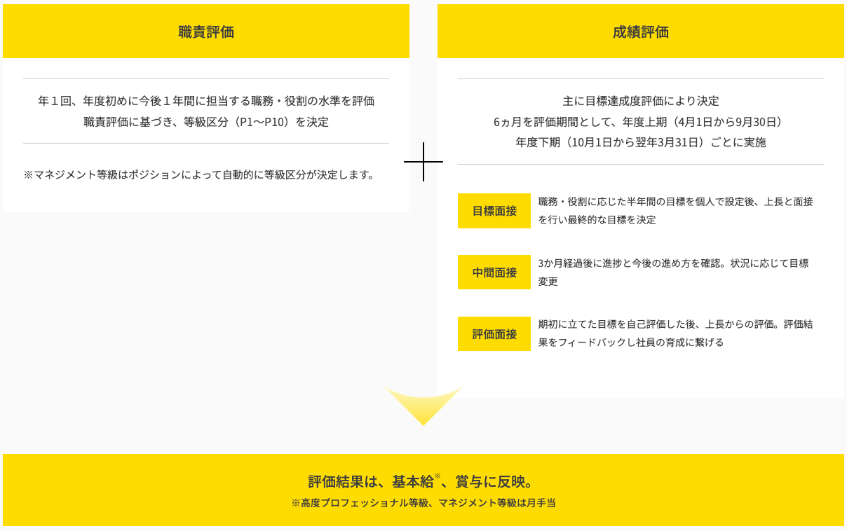 年度はじめに決めた目標を、半期ごとの面談などを通して評価されます。